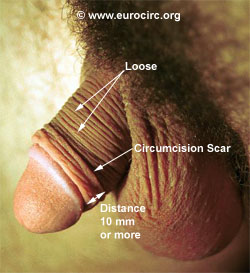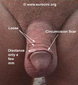 There is a distance of at least 10mm between the circumcision line and the glans but it still can touch or even cover the glans. + A lot of neural ends on the inner side of the skin remain intact and can be stimulated by exposure. + A second circumcision is possible if the result is not satisfying. - Different skin tinges (inner and outer foreskin) are definitely visible at the beginning. - Due to many skin crinkles i only looks like the foreskin being pulled back. - Regarding to hygiene there are hardly any advantages of this circumcision style. |